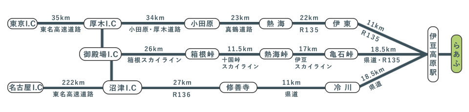 ・東名高速道路、厚木ICより約85km(小田原厚木道路「小田原西IC」を降りて国道135号線経由) ・東名高速道路、沼津ICまたは長泉沼津ICより約55km(伊豆縦貫自動車道・伊豆中央道・修善寺道路経由)