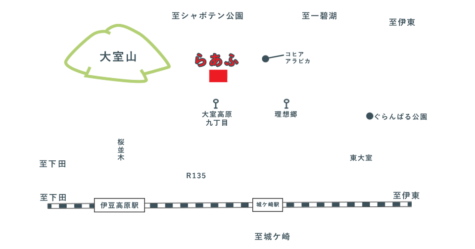 伊豆急行線「伊豆高原駅」下車後、東海バスで20分 「大室高原九丁目」または「理想郷」で下車後、徒歩5分